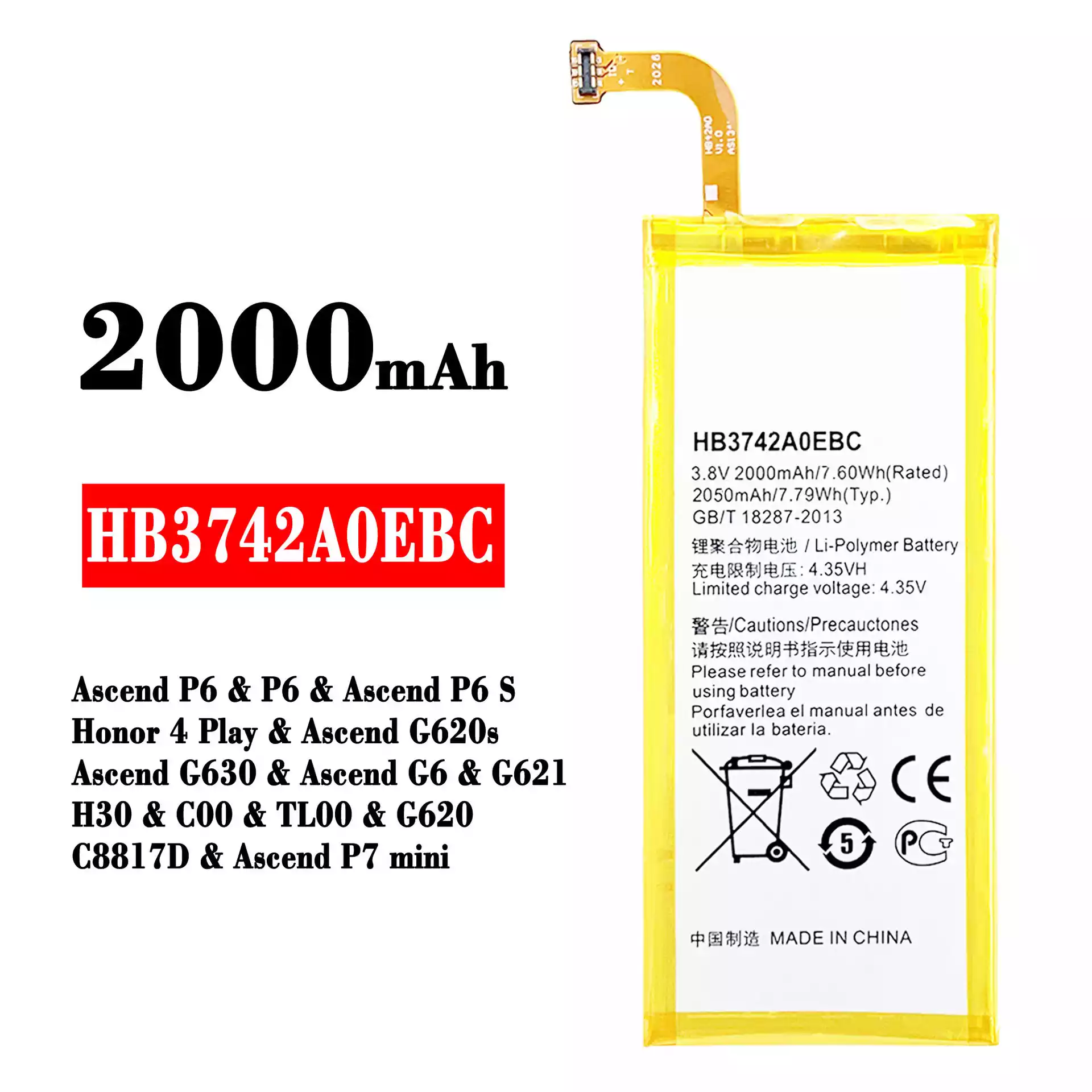 배터리 HB3742A0EBC 스마트폰 [화웨이] HUAWEI Ascend P6 / P6 / Ascend P6 S / Honor 4 Play / Ascend G620s / Ascend G630 / Ascend G6 / G621 / H30 / C00 / TL00 / G620 / C8817D / Ascend P7 mini